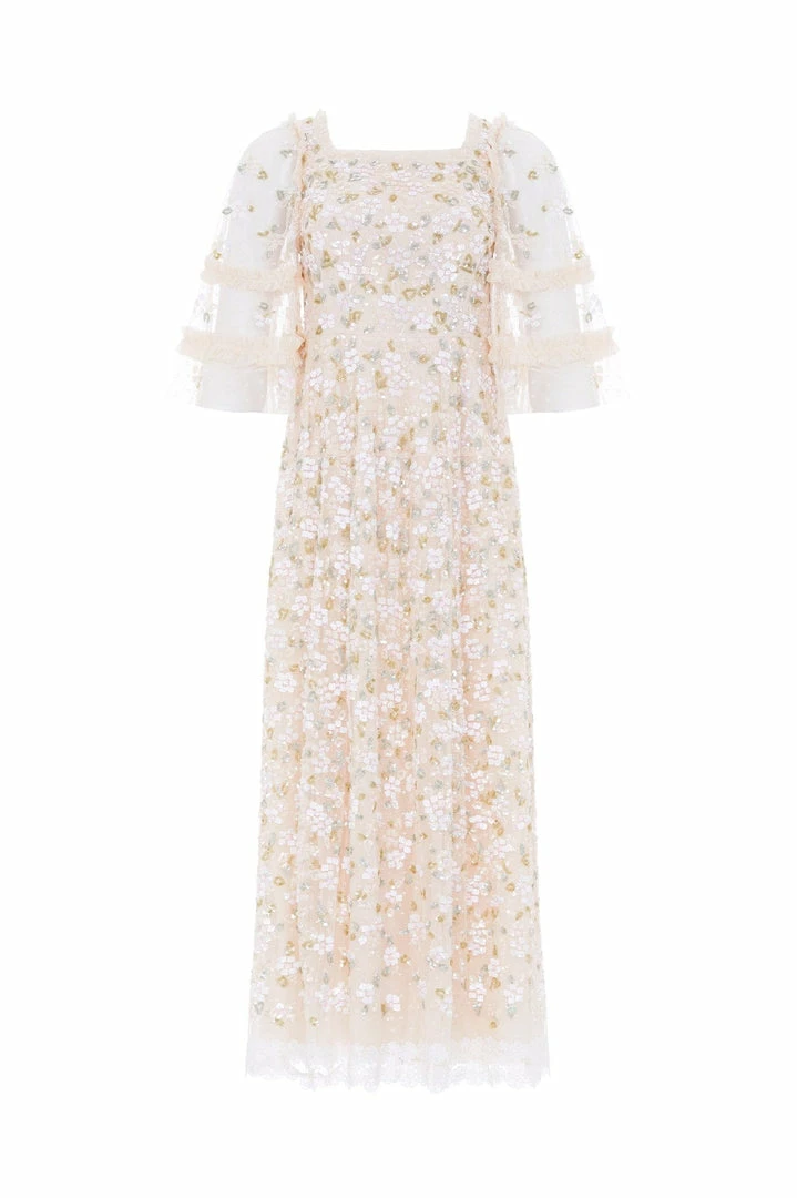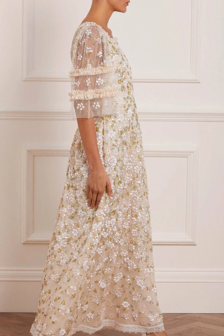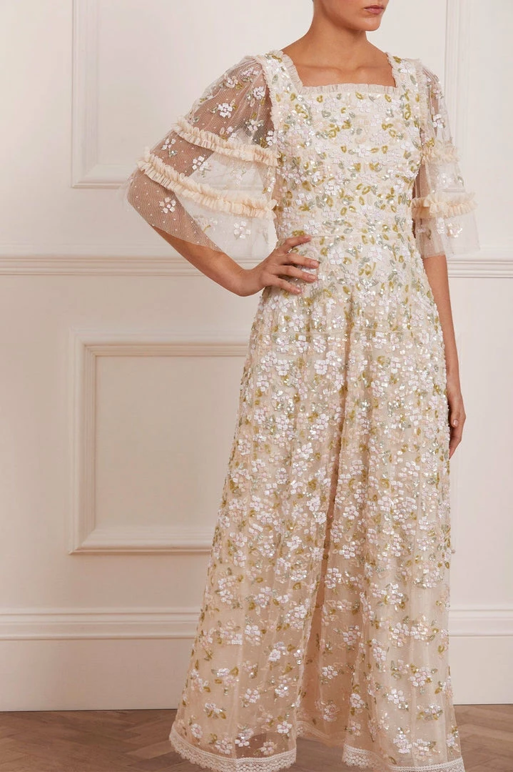The Pretty Petals Ankle Gown in Champagne / White. This gown is heavily adorned with sequin floral motifs throughout. Designed with a high, square neckline and couture-inspired skirt to create a truly classic piece. The skirt is developed with a net layer to hold this flattering shape. Make a statement in the Pretty Petals gown.