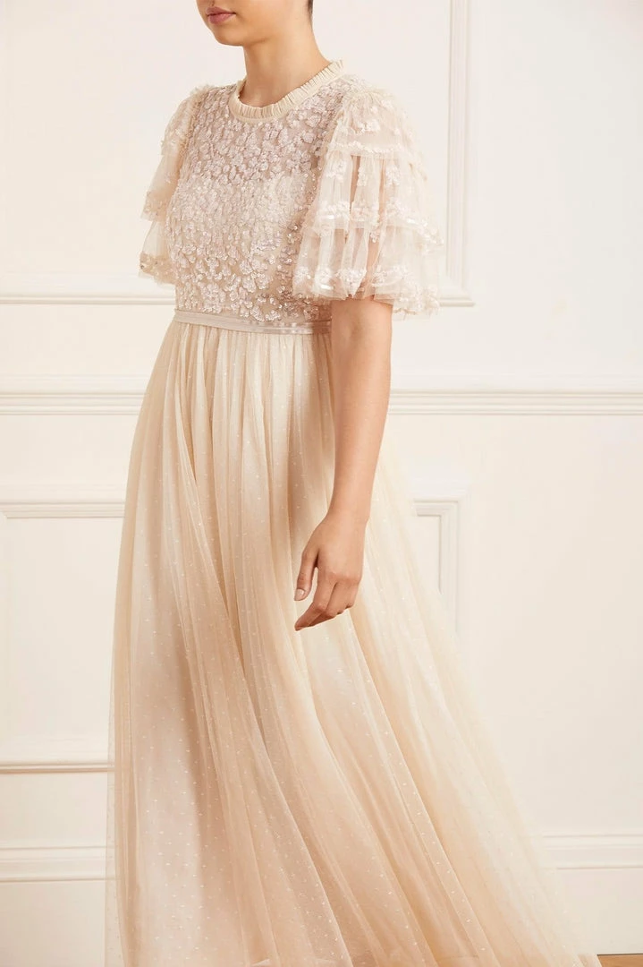 The Seren Bodice Ankle Gown in Champagne / Pink. This statement piece boasts romantic, layered, frill sleeves, with each tier separately adorned with glistening sequins delicately bordering the edge. Beautifully decorated on the bodice with floral motifs in tonal sequins to create an all-over shimmering effect. Designed with a multi-layered kisses tulle skirt, our signature Needle & Thread silhouette, and a ribbon waistband. A show-stopping dress for all occasions.