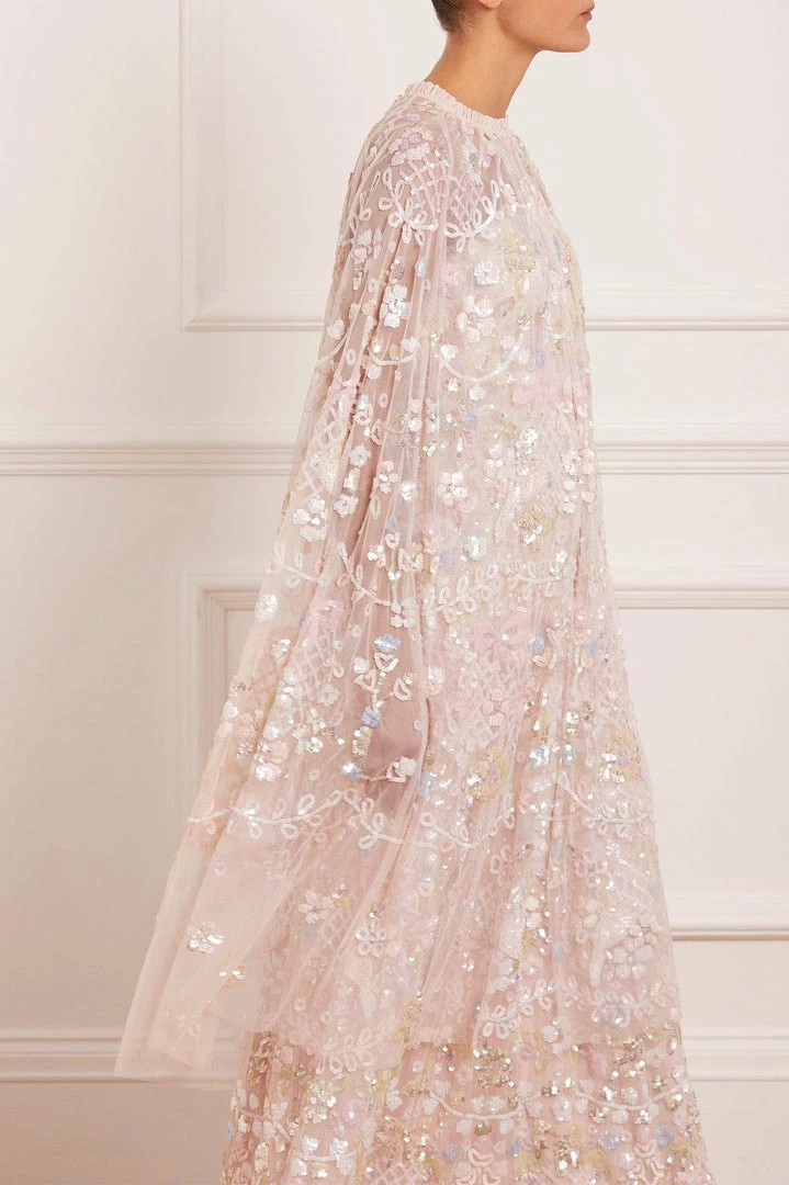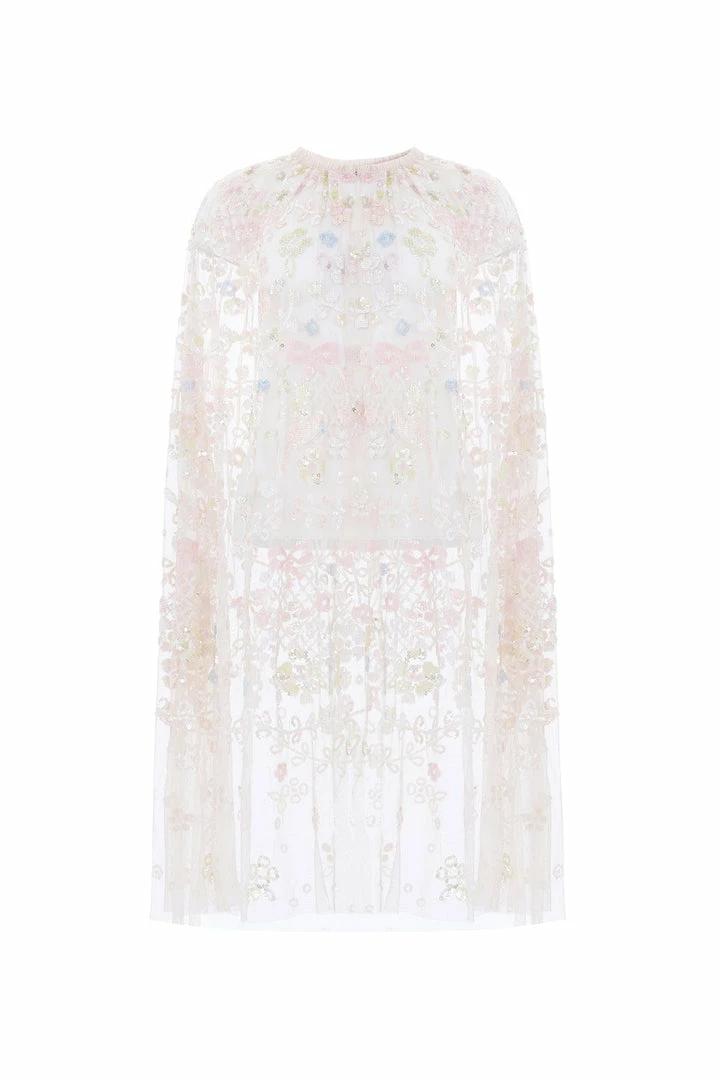 NEW SEASON | NEEDLE & THREAD EXCLUSIVE. The Shimmer Fairytale Midaxi Cape in Petal Pink / Sundaze. Intricately adorned with a multi-coloured floral and bird artwork with shimmering sequins to create a romantic look. Beautifully crafted from delicate, soft tulle and signature ruffle detailing throughout featuring an easy hook and bar finish at the neckline. The perfect styling piece to layer over the Shimmer Fairytale Corset Gown.