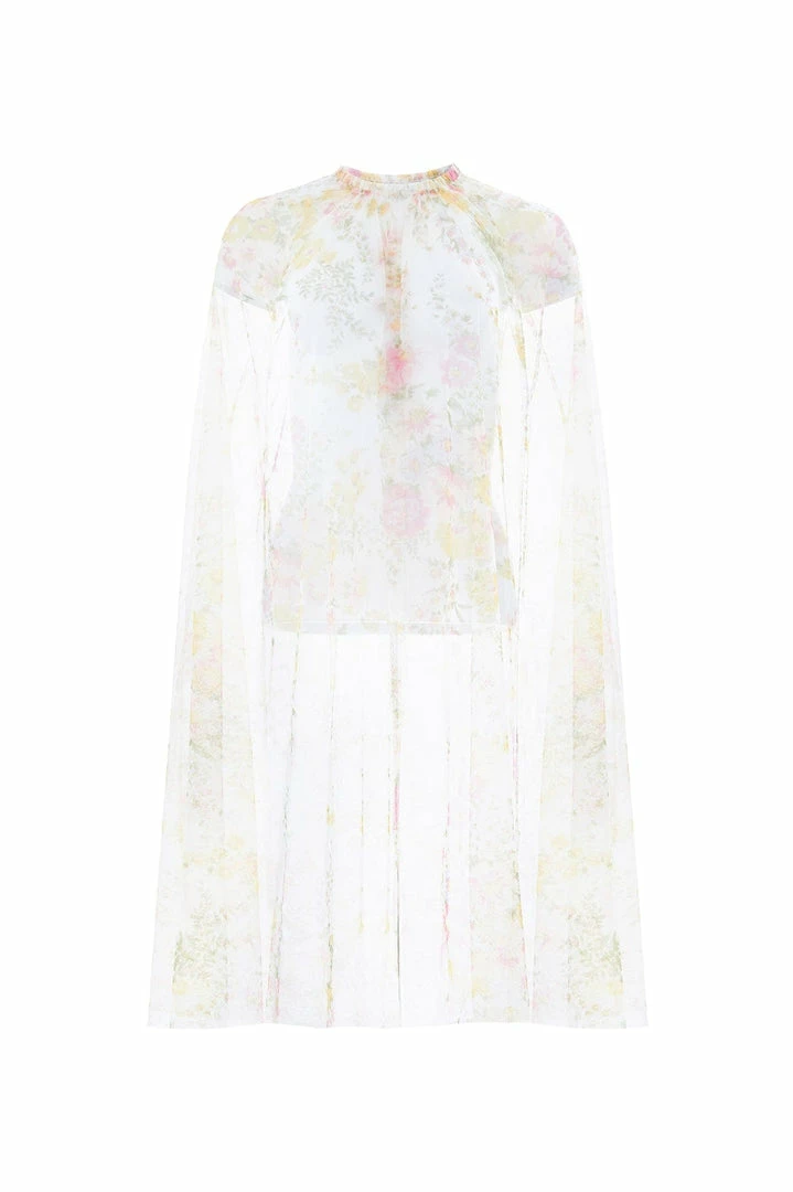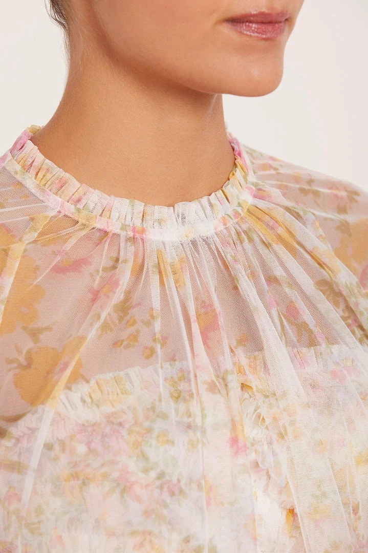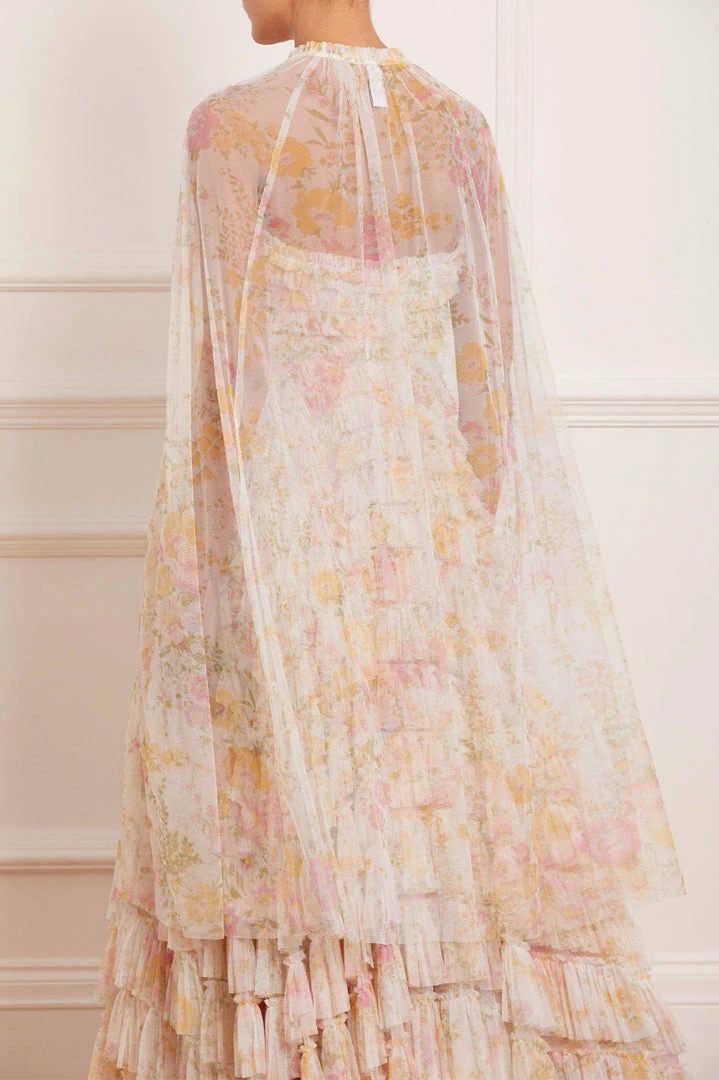 NEW SEASON | NEEDLE & THREAD EXCLUSIVE. The Sunrise Bloom Midaxi Cape in Moonshine. This cape is crafted from soft, delicate tulle and signature Needle & Thread detailing. The beautiful print has been developed from an early 1900’s hand-painted artwork featuring soft, sunny pastel florals. Designed with an easy hook and bar finish at the neckline. The perfect piece to layer over the Sunrise Bloom Corset Ankle Gown.