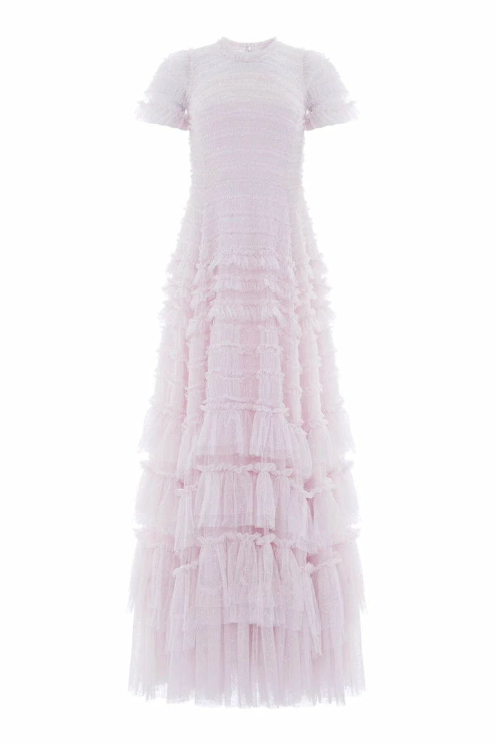 NEW SEASON. The Valentine Ruffle Gown in Powder Pink. A signature Needle & Thread style developed with textile ruffles and flattering tulle, creating a romantic look. The ruffles cascade down the dress, starting smaller and gradually getting bigger towards the hem to create soft, fluid movement. Crafted from our signature Needle & Thread kisses tulle. Make a statement in the Valentine.