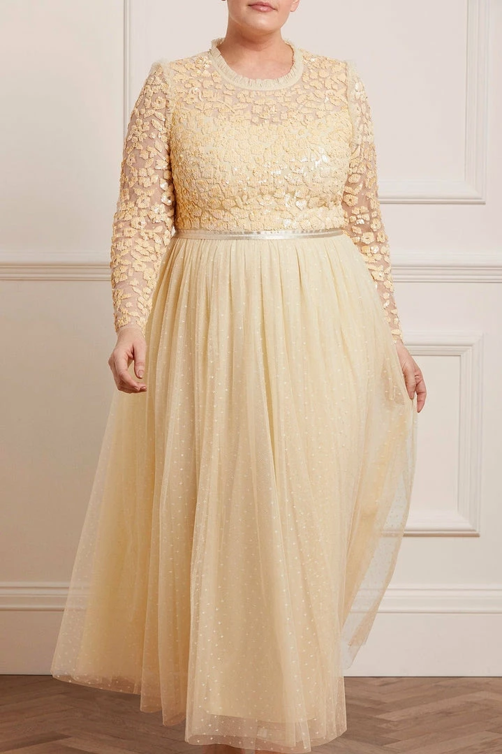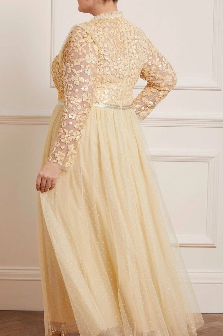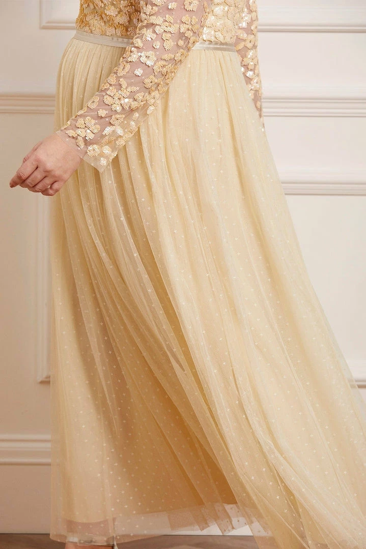 The Amalie Bodice Long Sleeve Ankle Gown in Buttercup. Featuring a bodice decorated with intricate shimmering sequins and floral motifs, this gown is designed with a layered tulle skirt featuring ‘x’ kiss motifs throughout, adding subtle texture. Make this gown your new season go-to.